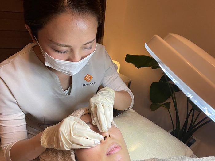 お顔にゲルを塗り、シートマスクを重ねていくのですが、その瞬間にお顔の上で炭酸ガスが発生するので、少し刺激的ですが、その分結果を感じて頂きやすいです。